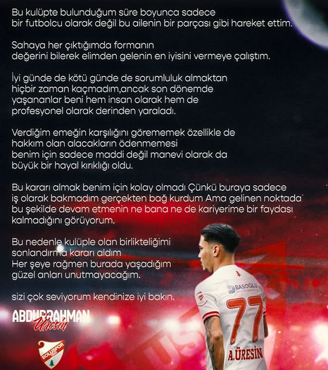 Defans oyuncusu Abdurrahman Üresin, sosyal medyadan yaptığı paylaşımla Boluspor’dan ayrıldığını duyurdu. Üresin, “Alacakların ödenmemesi benim için büyük hayal kırıklığı oldu” dedi.